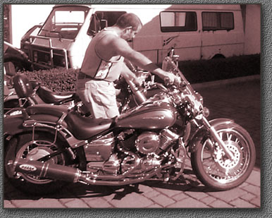 Meine Dragstar und ich So Leute dann stell ich mich mal kurz vor. Achja ich heiße Olaf. Ich bin etwas älter wie meine Dragstar Bj. 1966 um genau zu sein. Ich Cruise in der Regel in der Gegend um Krefeld. Es zieht mich aber natürlich auch in weitere Gefilde um hier und da nette Bikerinnen und Biker zu treffen und neu kennen zu lernen. Das Foto oben zeigt meine kleine ne Stunde nachdem ich sie beim Händler abgeholt hab. Wie man sehen kann mußte die Auspuffanlage sofort geändert werden. Mittlerweile hab ich noch die eine oder andere Kleinigkeit geändert. Weitere Fotos werden folgen. Vieleicht eine Beschreibung vorweg. Anderungen bis jetzt: Flyerbar mit Alugriffen und Kellermännern . Shark Auspuffanlage. Echt mal was anderes die fährt wenigstens nicht jeder fg. Die Scheibe ist natürlich ab. Vorverlegte Rasten sind mittlerweile auch dran. Kellermänner getauscht gegen Tigereyes von wegen hinten keine Blinker. Die neuen Spiegel machen auch deutlich mehr her. Zur Zeit in Arbeit: Zündspulenhalter links und der Lackierer hat auch Arbeit bekommen. Wenn das Bike soweit fertig ist, kommen die Bilder rein. | ||||||||||||||||||||||||||||||||||||||||||||||||||||||||||
